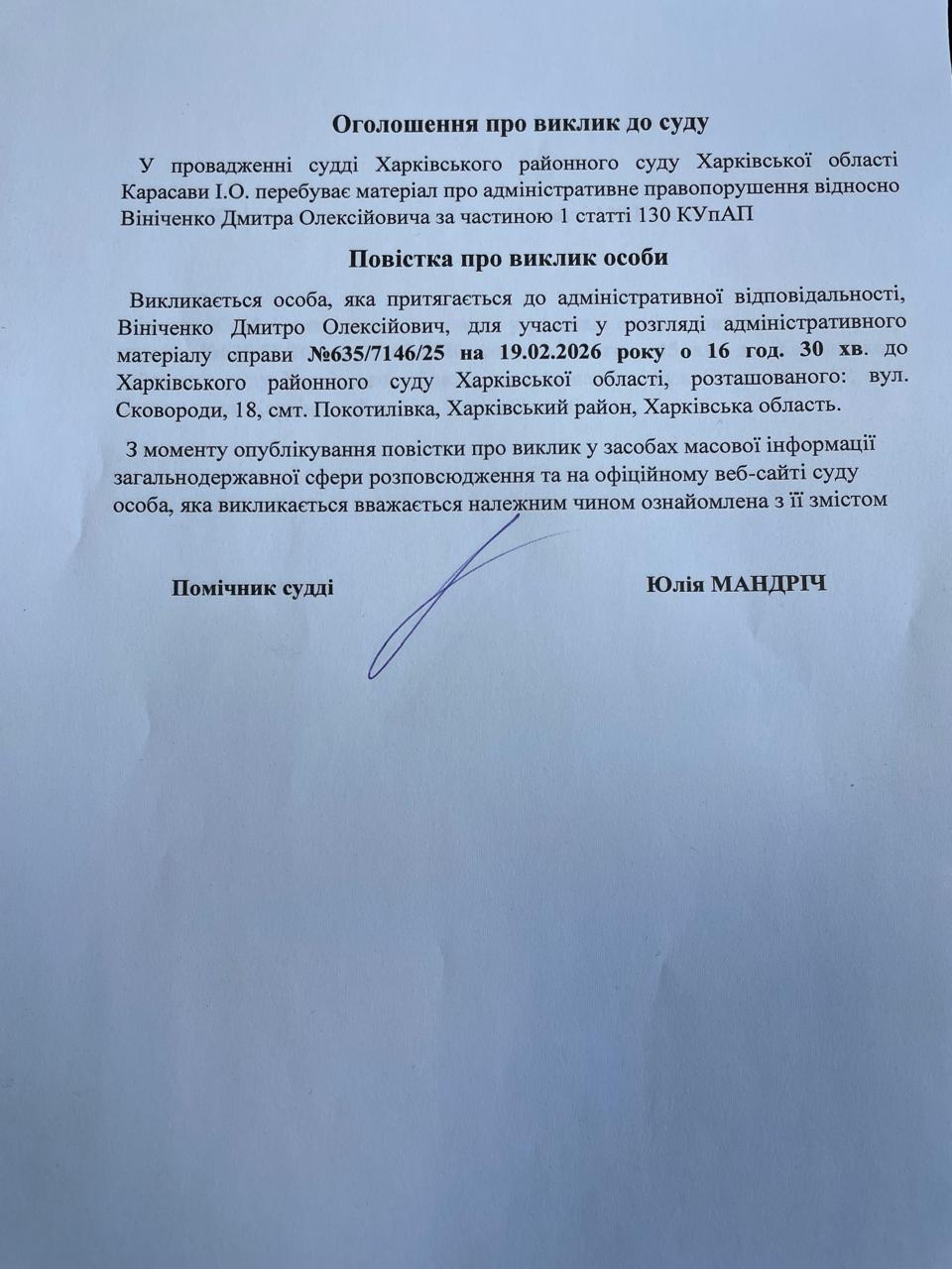 Оголошення про виклик до суду Вініченко Дмитра Олексійович по справі № 635/7146/25 на 19.02.2026 о 16 годині 30 хвилин