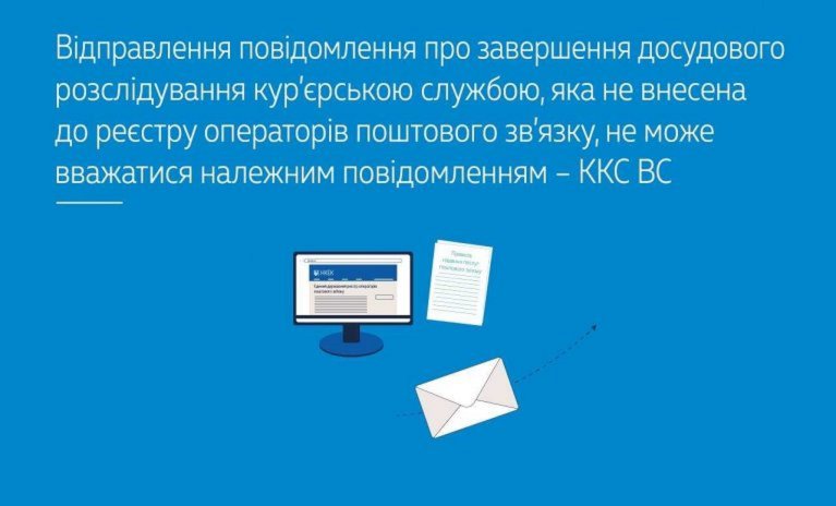 Залишаючи без зміни рішення судів попередніх інстанцій, Верховний Суд вказав, що матеріали кримінального провадження не містять підтверджень того, що захисник та обвинувачений отримали повідомлення про завершення досудового розслідування в передбачений законом спосіб. Так, на час направлення відповідного повідомлення стороні захисту про завершення досудового розслідування 7 червня 2024 року Національною комісією, що здійснює державне регулювання у сферах електронних комунікацій, радіочастотного спектра та надання послуг поштового зв’язку (НКЕК), вже було сформовано Єдиний державний реєстр операторів поштового зв’язку та, відповідно, проводився облік операторів поштового зв’язку, проте в ньому відсутні відомості, що ПП «Науково-виробнича Фірма "ТВІН-ДМ"» є оператором поштового зв’язку з доставки поштових відправлень і може надавати послуги у встановленому законом порядку.