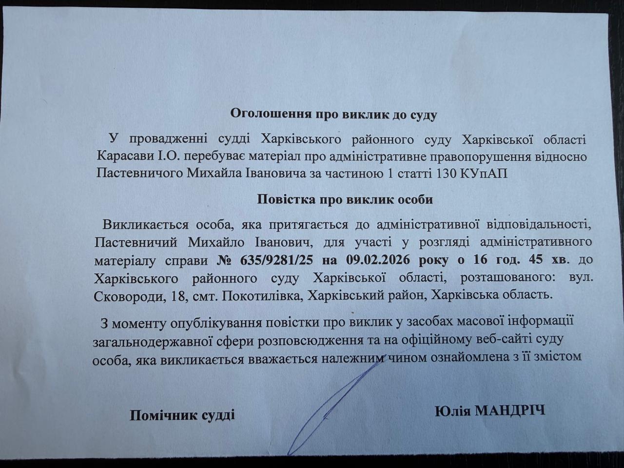Оголошення про виклик до суду Пастевничого Михайла Івановича по справі №635/9281/25 на 09.02.2026 о 16 годині 45 хвилин