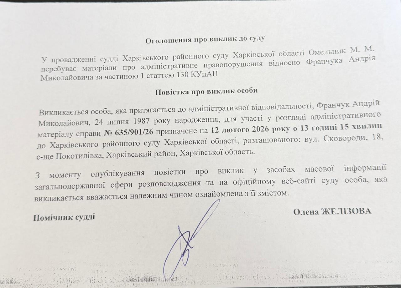 Оголошення про виклик до суду Франчука Андрія Миколайовича по справі №635/901/26 на 12.02.2026р о 13 годині 15 хвилин