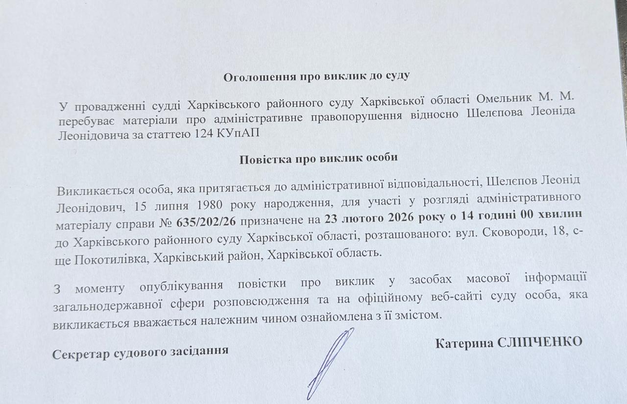 Оголошення про виклик до суду Шелепова Леоніда Леонідовича по справі №635/202/26 на 23.02.2026 о 14 годині 00 хвилин