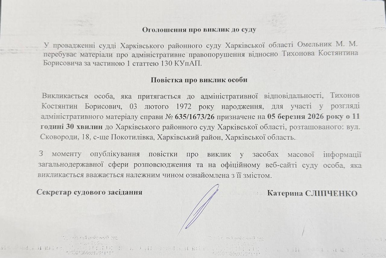 Оголошення про виклик до суду Тихонова Костянтина Борисовича по справі №635/1673/26 на 05.03.2026 о 11 годині 30 хвилин