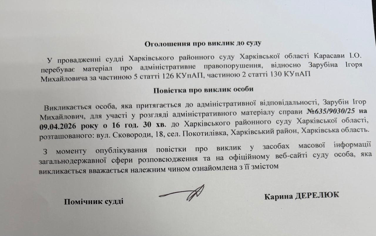 Оголошення про виклик до суду Зарубіна Ігоря Михайловича по справі №635/9030/25 на 09.04.2026 о 16 годині 30 хвилин