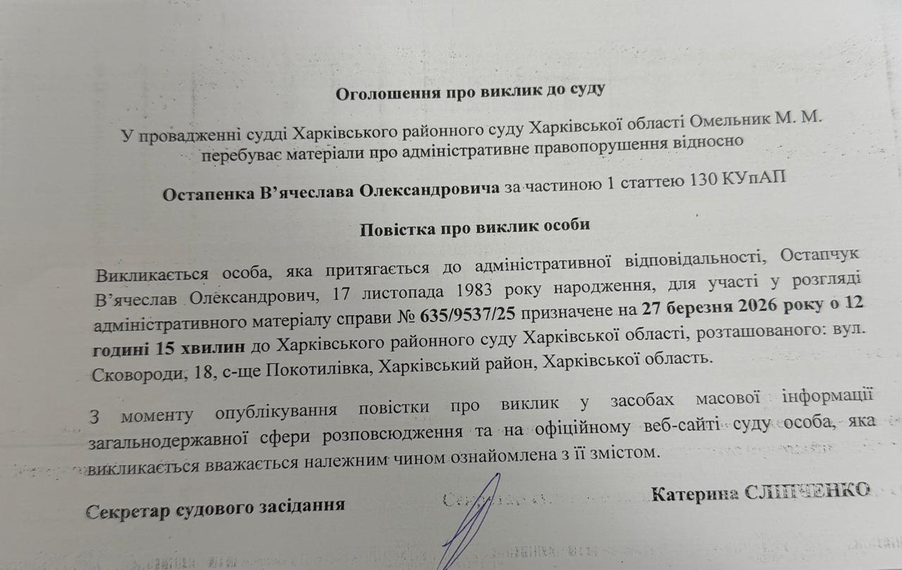Оголошення про виклик до суду Остапенка В'ячеслава Олександровича по справі №635/9537/25 на 27.03.2026 о 12 годині 15 хвилин