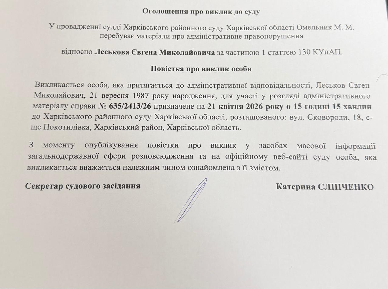 Оголошення про виклик до суду Леськова Євгена Миколайовича по справі №635/2413/26 на 21.04.2026 о 15 годині 15 хвилин