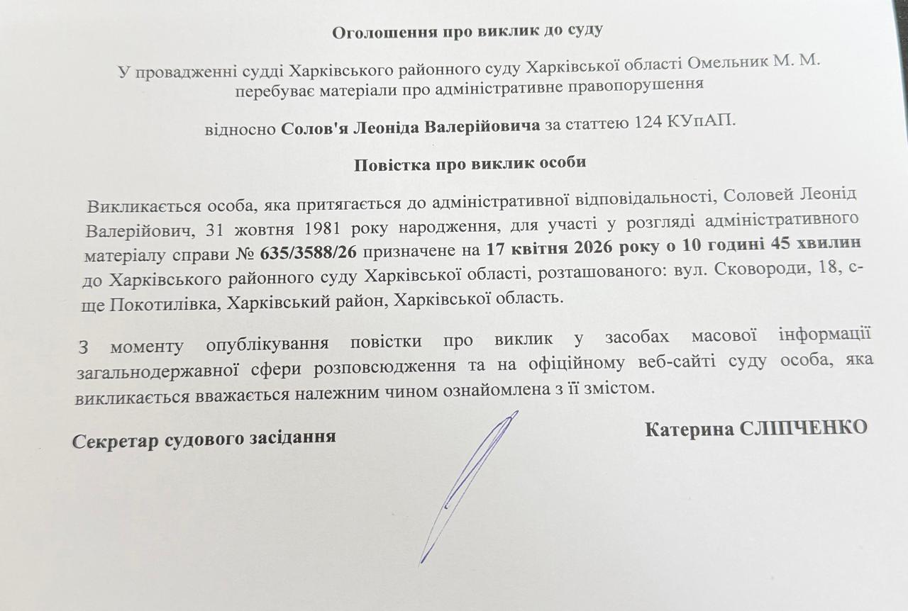 Оголошення про виклик до суду Солов'я Леоніда Валерійовича по справі №635/3588/26 на 17.04.2026 о 10 годині 45 хвилин
